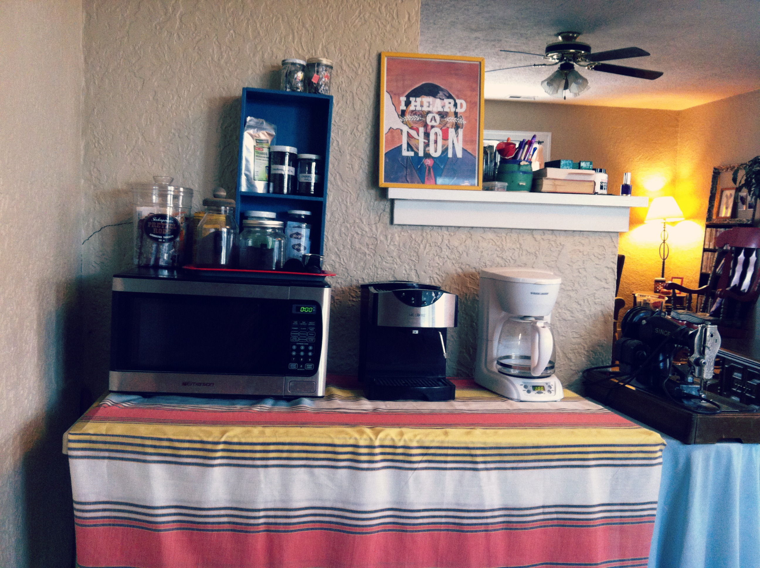 What we have here is a lovely print fabric ruined by all manner of coffee stains, an unsightly Rubbermaid tub stuffed to overflowing with boxes of tea, a can of coffee, generic garbage, and a 2013 Nice Jewish Guys calander. Unseen: dust, gunk, grime.