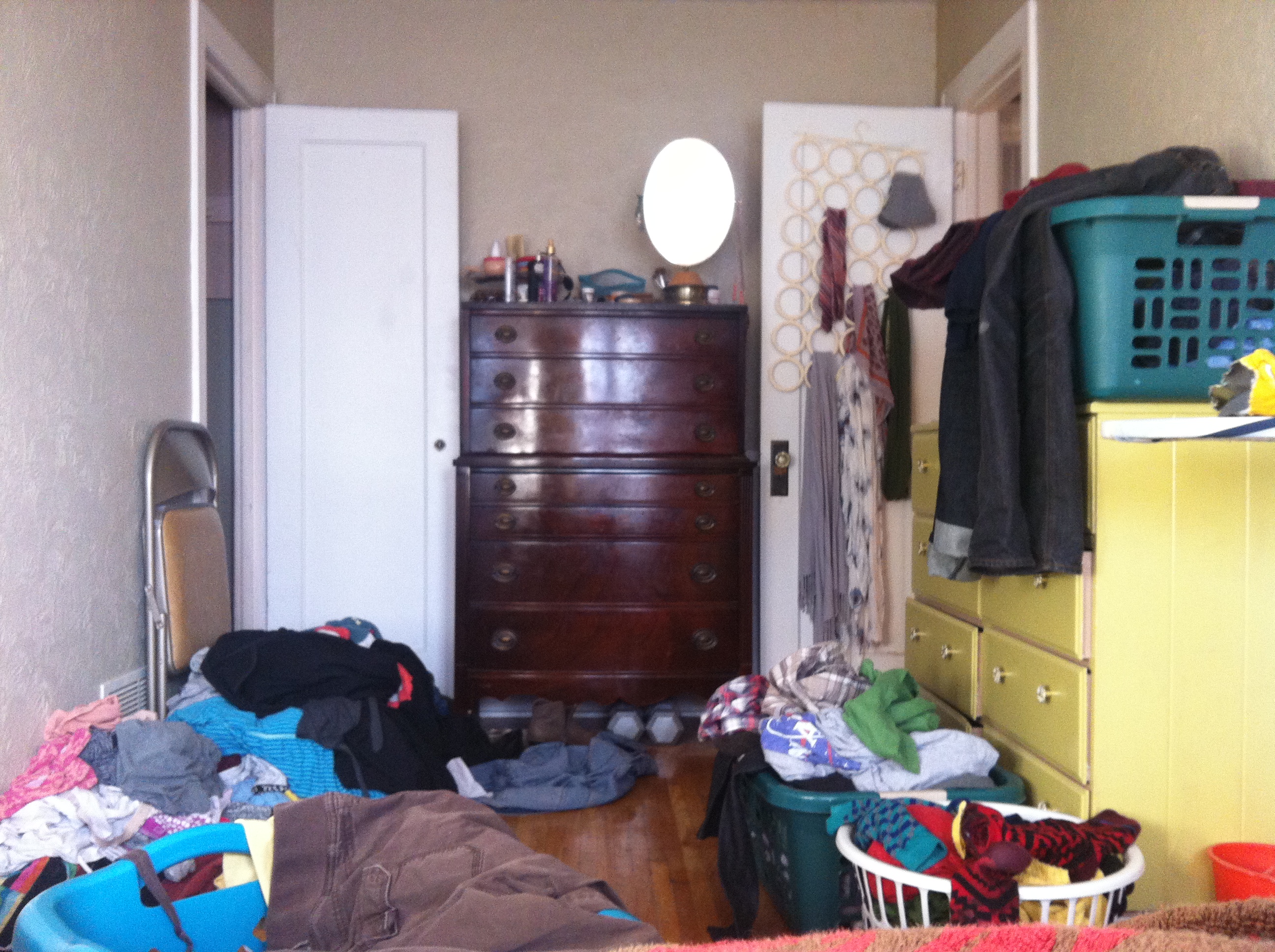 Fast forward fifteen years… yeah, we’re still in that same holding pattern. I thought, for sure, that when Ryan moved in it would be so easy to keep the bedroom clean because of, I don’t know, shame or something? But, alas, it’s actually more difficult on account of the lack of space for items and things.